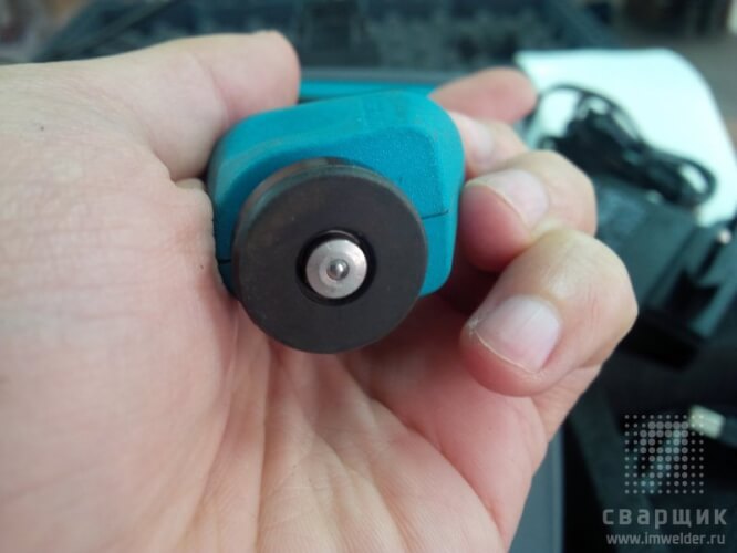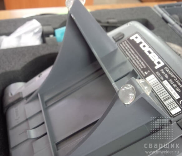 Среди портативных твердомеров эта модель уж точно не самая компактная. Габариты довольно внушительные и таскать с собой само устройство, а уж тем более чемодан, не удобно. Нет крепления ремешка чтобы вешать на шею. Зато есть довольно удобная съемная подставка с противоскользящими ножками. Довольно удобно с ней проверять твердость на трубах. Держится на трубе уверенно, больше вероятность просто рукой скинуть прибор, чем он соскользнет с трубы. На 159 трубе я бы уже не советовал располагать прибор, так как он уже на такой трубе не держится.