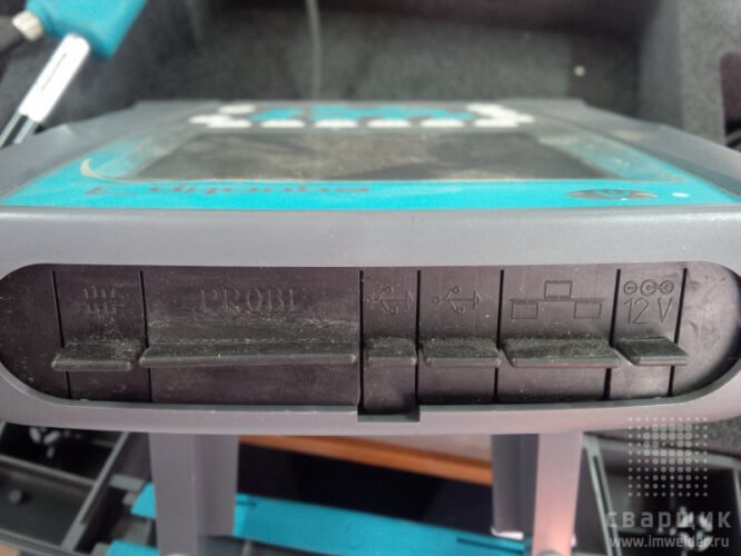 Разъемы слева на право – RS232 (мини DIN для принтера), разъем подключения датчика, два USB разъема (тип А и тип В), Ethernet разъем (RJ45) и разъем для подключения зарядного устройства. Кстати, если у вас села батарея, то подключив зарядку можно продолжить измерения.