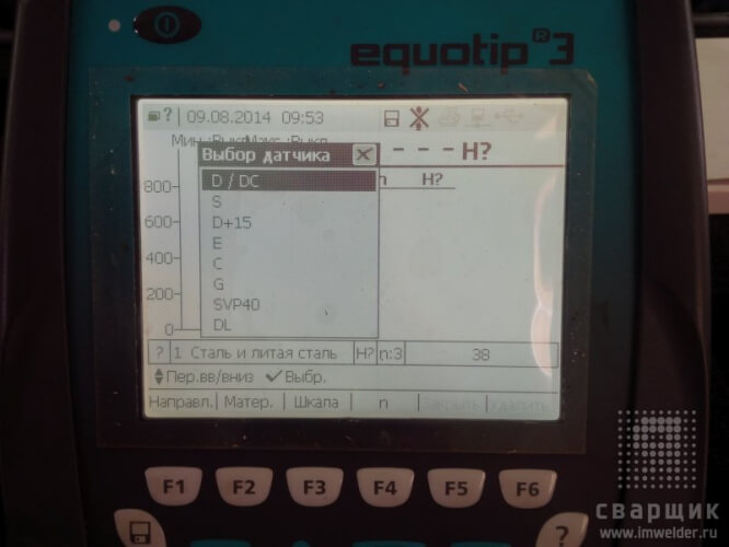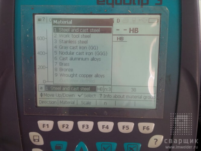 В меню очень много настроек – настройки языка (есть русский), выбор датчика, выбор материала (сталь, чугун, бронза, алюминиевый сплав и др.), число ударов, после которых считать среднее значение, выбор направления удара бойка (в том числе автоматический) и другие настройки.