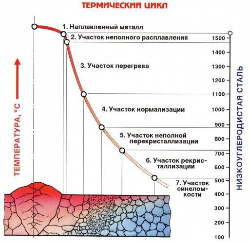 Нам интересен участок №7. Он также называется участком синеломкости и охватывает температурный диапазон от 200 до 400 °С. На этом участке наблюдаются синие цвета побежалости на поверхности металла (откуда и название). При сварке низкоуглеродистых сталей основной металл в этой зоне не имеет видимых структурных изменений, но наблюдается резкое падение ударной вязкости из-за снижения пластичности. Это происходит в тех случаях, когда в сталях содержится кислород, азот и водород в несколько избыточном количестве. Размеры отдельных участков ЗТВ и общая ширина ее зависят от условий нагрева, охлаждения и способов сварки. [4, 5]