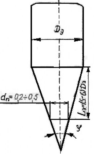 В ОСТ 36-57-81 требование такое: неплавящийся электрод перед работой должен быть заточен на конус. Угол конуса φ должен быть равен 28 - 30°, длина конической части (LК) должна составлять 5-6 диаметров электрода (DЭ). Конус после заточки должен быть притуплен, диаметр притупления (dП ) должен быть равен 0,2 - 0,5 мм.