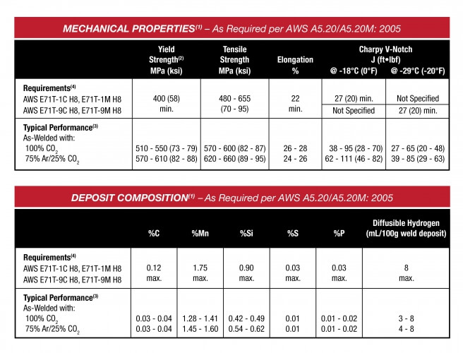 Во-первых, обратите внимание, что в соответствии со спецификацией присадочных материалов AWS, E71T-12М-JH8 проволока (т.е. "Т-12" проволока) не только имеет минимальное требование сопротивления на разрыв 483 МПа, но также имеет требование к максимальному сопротивлению в 620 МПа. Две других очень распространенных проволоки, классифицируемых "Т-1" и "Т-9" (например, E71T-1М / E71T-9М), имеют требование к минимальному сопротивлению на разрыв 483 МПа и максимальное требование сопротивлению на разрыв 655 МПа.